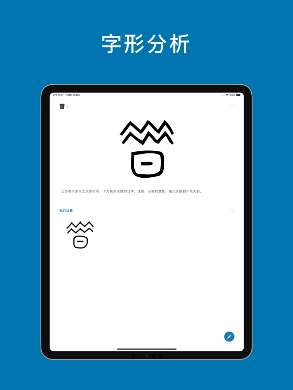 陌生而又熟悉的符号,似画、似字。 它就是「甲骨文」,现代汉字的起源。 本应用收录了 100 多种甲骨文字形。 临摹后可以解锁字形的更多信息。 一起来寻找潜藏的文化记忆吧! 注:支持新款 Apple Pencil 的双击操作 # 联系我们 * QQ 群:950307545 「西窗文化」荣誉出品。 古典文化,现代传承。* 修复无法临摹的 Bug