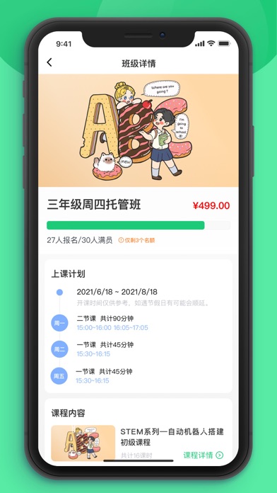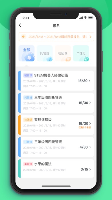 课后延时服务APP是一款为公立学校的小学生提供课后素质学习课程的选课平台,提供丰富的线下素质课程供学生/家长在APP中报名/购买,旨在将孩子在下午三点半放学后的这段时间充分利用起来,在解决家长的下班时间与孩子放学时间无法对接的问题的同时,还能促进学生的综合素质发展。请注意:仅在学校参与课后延时服务并通知家长使用时,家长才有必要使用本应用,否则您会因为无法绑定参与的学生信息而无法使用本应用的功能。班级报名名额已满的情况下允许提交候补报名申请。
