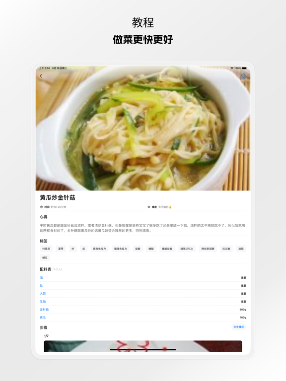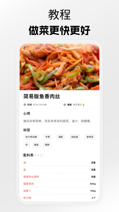 核心特色: • 高效呈现所有用料、用具、步骤,一目了然。 • 精心研发容易上手、不易失败的美味菜谱,比如略有难度的鱼香肉丝、宫保鸡丁,研发团队研究出鱼香汁、宫保汁的简单配比,只要跟着菜谱做,零厨艺也能做出不失手的经典菜肴。 • 所有食材、调料的用量精确到克、毫升,杜绝”适量“、“少许”等令新手头痛的模糊词汇。 • 明确炖煮、炒制等步骤所需时长,避免新手因难以判断食材成熟程度,导致做不熟或者糊锅的问题。 • 保留详细的图文菜谱,也可以只看文字模式,更方便学习完整的烹饪技巧。 • 提供烹饪所需时间、难度描述、菜谱评分等维度,辅助新手做菜谱选择。 更多贴心功能: • 「吃什么」:按照每个人不同的需求,比如早餐、西餐、家常菜、烘焙等分类进行随机吃什么趣味推荐,还有更多惊喜等待你的发现。 • 「收藏」:遇到喜欢的菜谱,可以点击小心心,把它收藏到自己的菜谱,方便下次查看。.优化bug .新增丰富的uI元素