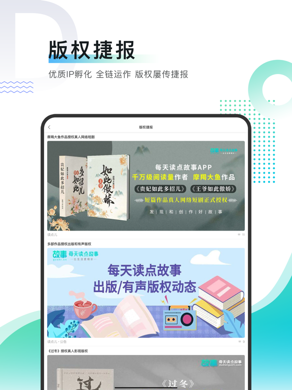 每天读点故事APP坚持“原生、奇崛、动人”的内容主张,注重”故事创作素材“的原生性、“情理之中意料之外“的戏剧性、“能触动人”的情绪关联性,内容主打女性悬疑惊悚、现实情感、浪漫言情、国风幻想、职业故事等类型化文学。 【短剧】 每天读点故事APP自2021年以来着重在短剧赛道发力,与多家头部影视公司合作并开辟短剧、微短剧多种体量合作模式,已成功授权独家签约作品《情难自控》、《悬溺》、《胭脂围城》、《匿名短信》、《初恋物语:爱在屋檐下》等数十部作品进行短剧开发,其中由《情难自控》改编快手短剧《前方高能》平台播放量超3亿次。 【电影】 平台凭借在现实、悬疑、幻想等类型内容方向的深耕,以及中短篇文学作品改编电影的天然优势和大量储备。和国内知名导演、制片以及电影公司积极建立合作,目前已成功授权《无畏布施》、《赛博神话:祸乱时期的爱情》、《行者》、《过冬》、《行镖》、《奇物志:日抛脸》、《超完美杀人案》、《大话西游之八十二难》等多部独家签约作品进行电影开发。 【出版】 读点APP已与多家出版文化公司和出版社达成合作,已成功授权《她从梦里来》《京城情报司》《影帝他总想对我图谋不轨》《宇宙留言》《羲河传》《神探太子妃》《凡人笔谈》《风水师报君知》《裁员专家》等数十部独家签约类型作品进行实体书出版,其中《愿所有的姑娘都能嫁给爱情》是由读点APP和出版方联合征文的获奖作品集结成书。 【网剧】 平台积极探索类型小说的影视化可能,与业内多家影视公司达成合作,已成功授权《徙鸟迷途》《前夫的前妻》《裁员专家》《世界末日的那一年》《拜见仙君大人》《影帝他总想对我图谋不轨》《神探太子妃》《天增顺》等数十部独家签约类型作品进行真人网剧改编。 【我们的团队】 我们正在重新定义网络文学。 自每天读点故事创立以来,我们已赢得了上千万读者的青睐。 团队成员始终怀揣着这样的愿景: 通过发现和创造好故事,丰富人们的内心世界,让生活更加美好。 我们以发现原生、奇崛、动人的故事作导向,我们相信,故事有改变世界的力量。 每天读点故事创始成员分别来自字节跳动、人人网等互联网公司,以及博集天卷、知音漫客等出版团队,具有多年资深行业经验。 【每天读点故事自动续订服务说明】 - 订阅服务:连续包月 - 订阅周期:1个月 - 订阅价格:12元/月 - 付款:用户确认购买并并付款后记入iTunes账户。 - 续订:苹果iTunes账户会在订阅到期前24小时内扣费,扣费成功后订阅周期自动延长一个月。 - 取消续订:如需取消连续包月,请在当前订阅到期前至少提前24小时取消。 打开苹果手机“设置”->进入“iTunes Store 与 App Store”->选择“Apple ID”->点击“查看Apple ID”->在账户设置页面点击“订阅”->取消订阅。 - 隐私协议:https://m.gushi.cn/privacy_protocols.html - VIP会员服务协议:https://m.gushi.cn/vip_service_agreement.html - 连续包月服务协议:https://m.gushi.cn/vip_pay_monthly_agreement.html 【联系&反馈】 使用过程中,任何的问题和意见,App内点击【意见反馈】告诉我们您的宝贵意见。 也可以通过以下方式,与我们联系。 官方微信:微信号(dudiangushi2018) 官方微博:每天读点故事 合作请联系:bd@tkpost.comBug修复和体验优化