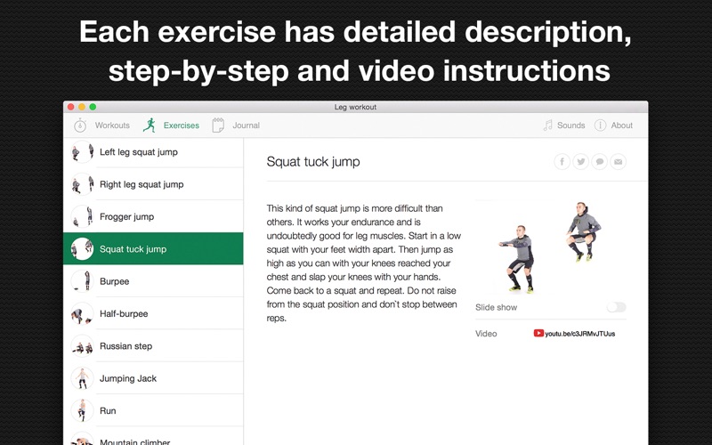 这个程序是您的最佳教练的腿! 腿的工作是不容易的。泵大小腿容易然后让他们真的很强,钢铁和功能。蹲,跑,跳等 - 这将有助于你做出美丽的腿。另外不要忘了健康食品和锻炼的规律性。 时间没有它不是一个借口。你需要每天只有6-20分钟! 你准备好考验你的耐力?是疯狂的生长,发育,使不可能的? 该应用程序包含在其中9试训部分: - 每节有15个训练,没有被重复: - 通过体育和健身教练制定所有训练; - 每一次的锻炼都有它自己的名字和想法; - 9种不同的板块不同:你可以选择你自己你所需要的 - 体操,壶铃,哑铃杠铃或不同组合; - 2段 - WARM-UP和心肺功能是多功能,你可以使用它了这个应用程序的概念。 并且: - 每一个运动都有详细的描述,照片和视频指令; - 精加工锻炼后,你可以分享到Facebook,Twitter和其他社交网络的结果。 醒来后,站起来,直到你达到你的目标,不要停! Some bugs fixed Small design changes
