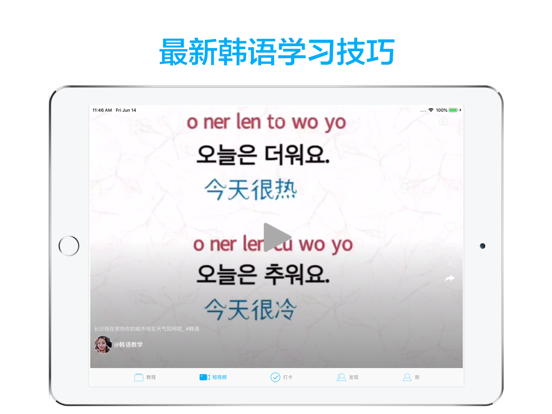 本应用搜集网罗了各类精品高清韩语视频教程 【韩语入门提高技能必备应用,韩语学习神器】 特色: 1. 常用句型: 汇整食衣住行育乐,生活常用句数百则,让您即使没基础也能透过老师讲解以及真人发音学习轻松开口说韩文。 2. 真人教学: 由留学韩国,教学经验丰富的专业韩文教师实际教学,如同课堂的上课体验,让您学习精准的发音。 3. 单词: 句型中出现的单词以及相关字替换,让您贯彻了解句型以及单词涵义。 4. 句子翻译: 透过清楚的讲解及情境描述让您可以学习造句并实际应用句子。 5. 类似词介绍: 介绍类似的单字以及用法比较,让您轻松区分并搞懂不同对象及场合适用的句型及单字。修复 bug 适配 iOS17