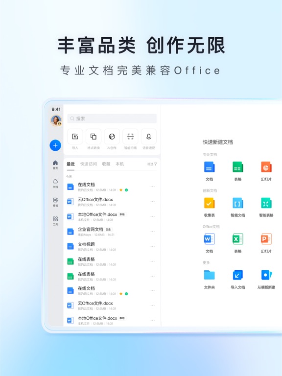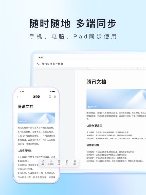 -----腾讯文档是什么?----- 腾讯文档是一款可协作的云端Office工具,拥有Word/Excel/PPT/PDF/收集表等办公品类和智能文档/智能表格/智能白板/思维导图/流程图等创新应用。随时随地查看编辑,内容实时同步,无缝跨端创作。 -----腾讯文档能做什么?----- 【内容创作】 本地/云端编辑:支持编辑云文档和直接查看、编辑、创建本地Office文档,格式深度兼容; 富媒体编辑:支持插入文本、图片、视频等丰富的素材形式; 实时保存:编辑文档时实时自动保存,内容不丢失; 海量模板:信息收集、打卡签到、会议纪要、日报、项目管理信息表等各类模板。 【多人协作】 多人编辑:支持多人同时在线编辑,可查看编辑记录; 多端同步:各类型设备皆可顺畅访问,内容实时同步,随时随地使用; 文档分享:生成链接或长图,分享给QQ/微信好友、微博及朋友圈,方便快捷。 【AI助手】 写作助手:一句话生成文档、表格、幻灯片等全品类文档,支持文章润色、扩写、续写; 阅读助手:一键快速阅读学术论文、行业报告、财务报表等内容; 数据助手:支持AI写函数、做图表、生成数据报告、进行数据问答。 AI模型:支持混元及DeepSeek-R1满血版大模型 【数据安全】 权限控制:可灵活设置查看及编辑权限,文档安全尽在掌控; 技术保障:云端存储加密技术为文档安全保驾护航; 版权保护:文档支持设置和展示水印,版权有保障。 ----联系我们—---- 腾讯文档官方网站:docs.qq.com 意见反馈:登录腾讯文档,进入“设置-意见反馈”进行反馈。 如果你觉得腾讯文档还不错,请给我们五星好评~ 如果在使用过程中有任何问题,欢迎在评论区留下意见。你所需要的,就是我们努力的方向。 -----腾讯文档会员/腾讯文档超级会员自动订阅服务说明----- 1、腾讯文档会员自动订阅服务有以下一种订购类型: 9元/1个月。 腾讯文档超级会员自动订阅服务有以下订购类型: 18元/1个月; 58元/3个月; 158元/1年。 腾讯文档超级会员Plus自动订阅服务有以下订购类型: 38元/1个月; 288元/1年。 2、订购腾讯文档会员/腾讯文档超级会员/腾讯文档超级会员Plus服务会通过iTunes账户直接支付。 3、在订购服务到期前24小时,系统将按订购类型进行自动续订和扣除相应费用。 4、如需关闭自动订阅服务,请至少提前24小时在“账户设置”中进行操作。 5、隐私政策及使用条款: 腾讯文档会员/腾讯文档超级会员/腾讯文档超级会员Plus: 隐私协议:https://docs.qq.com/doc/p/30cb57a3280b16bd48fb49001022ada97479339a?dver=2.1.0&u=0c11626e1f6544afa462d3fb233a1e22 服务协议:https://docs.qq.com/doc/p/f32c54a1479912b10ceb2763f74b5f16765b3afb?dver=3.0.27446518 自动续费协议:https://docs.qq.com/doc/p/3a889f75320d55f41ae98ad39853309c355c5ef1?dver=3.0.27439387本次更新: - 新增速记创建能力,支持 文字/语音/AI 等多种快速创作方式 近期更新: - 支持添加桌面端快捷小组件,多种方式快速创作 - 文档支持生成桌面图标,常用文档一键打开