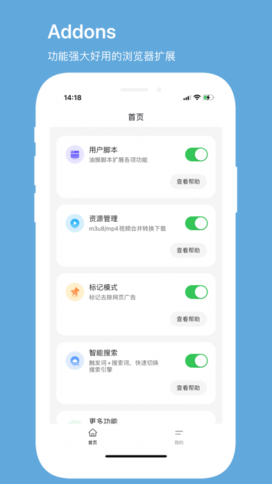 【全平台支持】 能够在iPhone、iPad和iMac上同时使用,并且支持数据同步。 【油猴脚本】 油猴脚本功能是Addons的特色之一。油猴脚本可以让您添加自定义的脚本,以实现更多功能,比如自动翻页,骚扰拦截,自动展开,网页翻译等等。 这个功能非常强大,可以让您的Safari浏览器拥有无限可能。 【资源嗅探】 资源嗅探功能是Addons的另一个亮点。支持网页视频、m3u8格式的文件缓存,m3u8自动合并转换成mp4。支持视频后台播放和导出。 让您随时随地畅享高清大片。 【自定义广告过滤】 Addons不仅能够帮助您拦截烦人的广告,还可以提高网页浏览速度,提供更优质的用户体验。 与AdGuard和Adblock Plus类似,Addons的自定义规则功能可以让您更加灵活地控制广告拦截的精度,满足您个性化的需求。 【标记模式】 广告过滤功能可以让您在浏览网页时摆脱烦人的广告。Addons支持标记模式,让您去除网页广告的同时保留有用的内容,让您的浏览体验更加纯净舒适。 【智能搜索】 智能搜索功能可以让您通过【触发词+空格+关键词】,快速切换Safari的搜索引擎。无需多次手动更改设置,一键即可完成。 【网页暗黑模式】 最后,Addons还支持网页暗黑模式,帮助您更好地保护眼睛,在晚间无需为过强的白光而苦恼。 夜间模式支持高度自定义,有十几种主题样式选择。 总之,Addons是一款功能丰富、使用方便的Safari浏览器扩展,它可以让您的Safari浏览器拥有更多的自定义功能和好用的工具,让您的Safari浏览器拥有无限可能!快来体验吧!1.优化油猴脚本功能 2.优化发热问题与用户体验 3.优化暗黑模式 4.修复相关崩溃