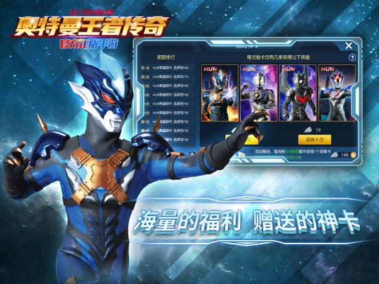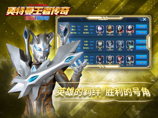 《奥特曼王者传奇》是一款奥特曼正版授权的3D动作卡牌手游。光之巨人悉数登场,黑暗怪兽再次来临,光明与希望能否重新莅临这个世界? 全3D视觉特效,真实还原奥特曼宇宙,新的风暴已经出现,怎么能够停滞不前?只要心中有光,你就一定能够靠着自己的力量变身成光! 佐菲、赛文、迪迦、赛罗、罗布、托雷基亚……全员齐聚,再现昔日经典场景,重燃王者传奇英雄梦。 【策略制胜,灵活搭配以弱胜强】 每个奥特曼都有他的独到之处,不同的技能搭配能碰撞出不一样的火花,搭配合适的阵容,发挥最强实力,这是策略与脑力的较量! 【不忘初心,自由收集精美卡牌】 百余张特色卡牌,几乎包含所有的童年回忆,极恶贝利亚,魔格大蛇,泽塔奥特曼,银河奥特曼,梦比优斯奥特曼等等,被巧妙地分配在各个领域,关卡、卡包、商店、碎片合成各类活动,免费收集,集实力与外形于一体,必定会是你的心头所好! 【成王败寇,全服竞技自由PK】 竞技大厅,可自由切磋所有的奥特英雄,亦可跨服添加好友。在这里,你将体验最残酷的PVP内容,挑战亦敌亦友的强大对手!占据排行榜的前列,成为万人膜拜的王者! 【星际争霸,跨服对决见招拆招】 团队合作还是独占星球?不同服务器互相切磋,M78星云最终由谁来守护?宇宙王者称号、英雄碎片自选包……海量奖励等你来拿! 修复部分已知Bug